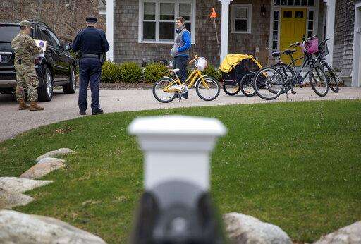 Rhode Island Air National Guard TSgt. William Randall, right, and Westerly police officer Howard Mills talk with New York resident Reha Kocatas who is self-quarantining at his home in Westerly, R.I., Saturday, March 28, 2020. The Rhode Island National Guard started going door to door on Saturday in coastal areas to inform any New Yorkers who may have come to the state that they must self-quarantine for 14 days. (AP Photo/David Goldman)