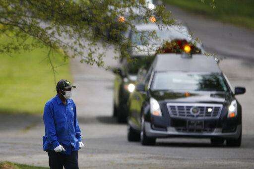A cemetery employee watches a procession carrying casket of The Rev. Joseph E. Lowery being moved to graveside by horse and carriage at the Westview cemetery, Saturday, April 4, 2020, in Atlanta. For more than four decades after the death of his friend and civil rights icon, the Rev. Martin Luther King Jr., the fiery Alabama preacher was on the front line of the battle for equality, with an unforgettable delivery that rivaled King's - and was often more unpredictable. (AP Photo/John Bazemore, Pool)