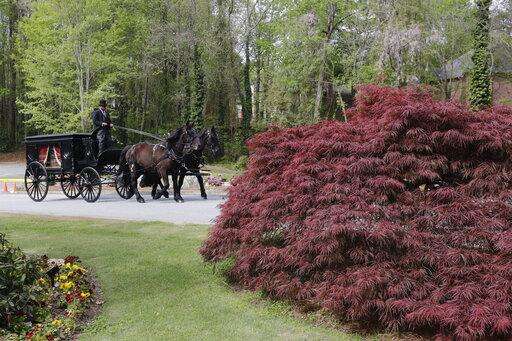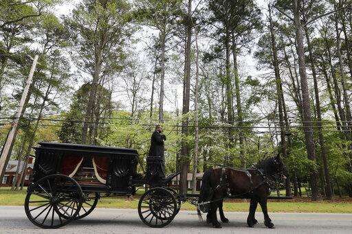 The casket of The Rev. Joseph E. Lowery departs Cascade United Methodist church by horse and carriage, Saturday, April 4, 2020, in Atlanta. For more than four decades after the death of his friend and civil rights icon, the Rev. Martin Luther King Jr., the fiery Alabama preacher was on the front line of the battle for equality, with an unforgettable delivery that rivaled King's - and was often more unpredictable. (AP Photo/Brynn Anderson)