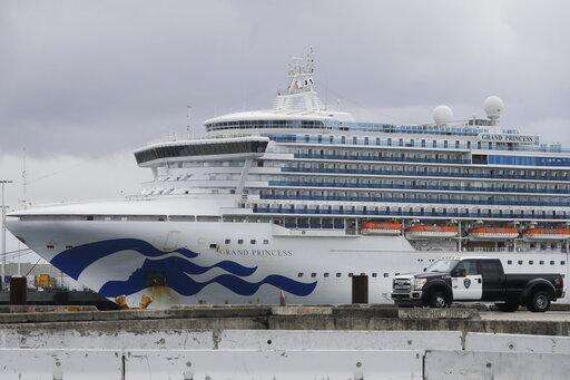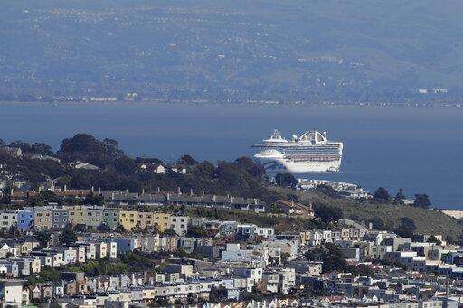 FILE - In this March 31, 2020, file photo, The Grand Princess cruise ship is shown docked in San Francisco. Nearly 650 crew members of the Grand Princess have completed their 14-day quarantine, ending a month-long period of self-isolation that began when the cruise ship was struck with the coronavirus. The cruise line said the crew members can finally leave their staterooms Saturday, April 4, and roam around the ship as long as they wear personal protective equipment and stay at least six feet from each other. The ship will leave San Francisco Bay and sail out to sea for several days of routine marine operations. (AP Photo/Jeff Chiu, File)
