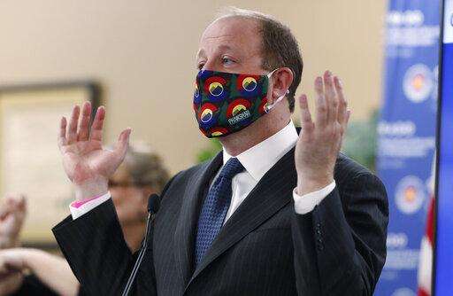 Colorado Governor Jared Polis dons a mask to encourage state residents to wear them while in public as a statewide stay-at-home order remains in effect in an effort to reduce the spread of the new coronavirus Friday, April 3, 2020, in Centennial, Colo. The new coronavirus causes mild or moderate symptoms for most people, but for some, especially older adults and people with existing health problems, it can cause more severe illness or death. (AP Photo/David Zalubowski)