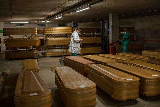 Coffins with the bodies of victims of coronavirus are stored waiting for burial or cremation at the Collserola morgue in Barcelona, Spain, Thursday, April 2, 2020. The new coronavirus causes mild or moderate symptoms for most people, but for some, especially older adults and people with existing health problems, it can cause more severe illness or death. (AP Photo/Emilio Morenatti)