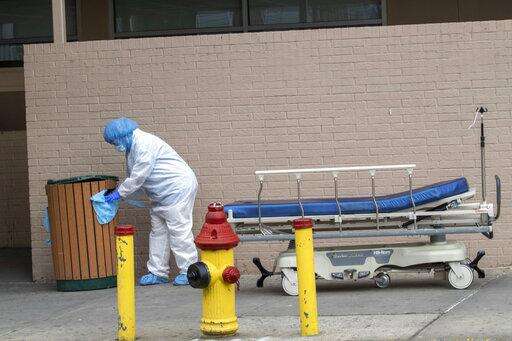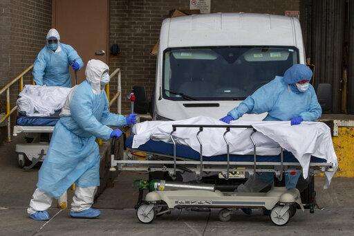 Medical personnel wearing personal protective equipment remove bodies from the Wyckoff Heights Medical Center Thursday, April 2, 2020 in the Brooklyn borough of New York. As coronavirus hot spots and death tolls flared around the U.S., the nation's biggest city was the hardest hit of the all, with bodies loaded onto refrigerated morgue trucks by gurney and forklift outside overwhelmed hospitals, in full view of passing motorists. (AP Photo/Mary Altaffer)