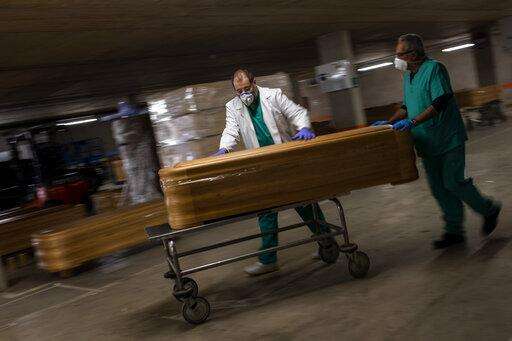 workers move a coffin with the body of a victim of coronavirus as others coffins are stored waiting for burial or cremation at the Collserola morgue in Barcelona, Spain, Thursday, April 2, 2020. The new coronavirus causes mild or moderate symptoms for most people, but for some, especially older adults and people with existing health problems, it can cause more severe illness or death. (AP Photo/Emilio Morenatti)