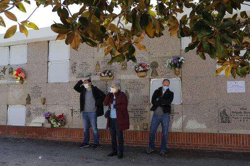 Relatives of Rafael Catalan Villasanti, 83, react during his burial during the coronavirus outbreak at the Carabanchel cemetery in Madrid, Spain, Saturday, April 4, 2020. The new coronavirus causes mild or moderate symptoms for most people, but for some, especially older adults and people with existing health problems, it can cause more severe illness or death. (AP Photo/Manu Fernandez)