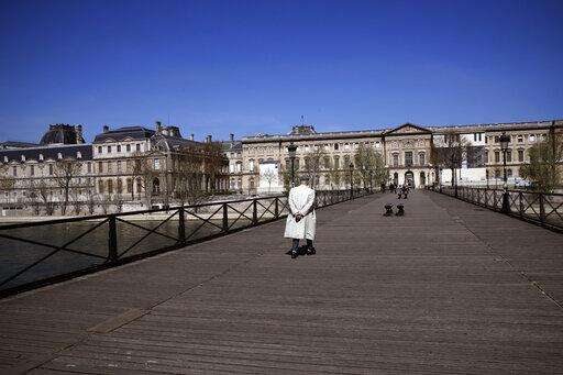 A man crosses a bridge during a nationwide confinement to counter the Covid-19, in Paris, Saturday, April 4, 2020. The new coronavirus causes mild or moderate symptoms for most people, but for some, especially older adults and people with existing health problems, it can cause more severe illness or death. (AP Photo/Christophe Ena)