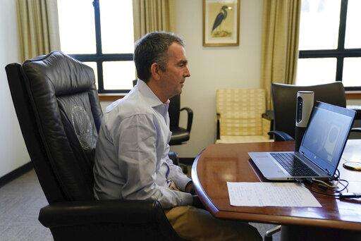 In this image provided by the Office of the Governor of Virginia, Virginia Gov. Ralph Northam as he participates in a Skype interview from his office at the Capitol in Richmond, Va., Thursday April 2, 2020. (Jack Mayer/Office of the Governor of Virginia via AP)