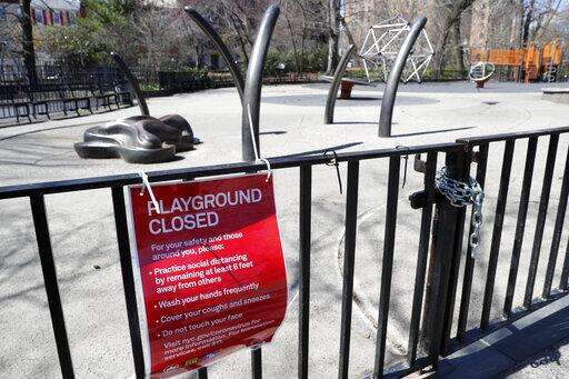Vanderbilt playground in Brooklyn's Prospect Park is closed on Thursday, April 2, 2020, in New York. On Wenesday, New York Gov. Andrew Cuomo ordered all of New York city's playgrounds shut to slow the spread of the coronavirus. The governor followed calls from public-health experts and many City Council members to shut the playgrounds as families gathered there. But the closures presented a new challenge for families weathering a lockdown that also closed schools. (AP Photo/Kathy Willens)