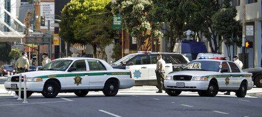 Law enforcement officers close Howard Street to vehicular traffic as activists protest outside Moscone Center on Friday, April 3, 2020, in San Francisco. (AP Photo/Ben Margot)