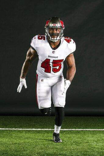 In this handout released by the Tampa Bay Buccaneers Tuesday, April 7, 2020, linebacker Devin White wears the team's new uniforms that they will debut during the 2020 NFL football season. (Tampa Bay Buccaneers via AP) The Associated Press