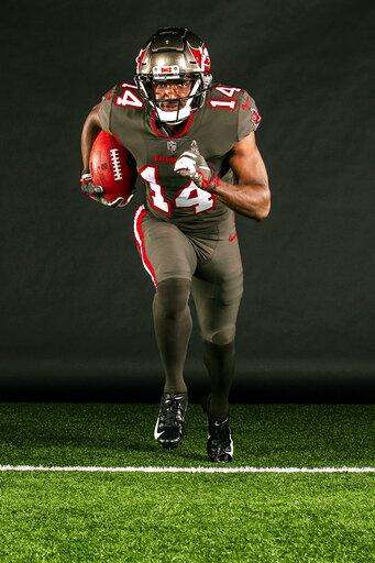 In this handout released by the Tampa Bay Buccaneers Tuesday, April 7, 2020, wide receiver Chris Godwin wears the team's new uniforms that they will debut during the 2020 NFL football season. (Tampa Bay Buccaneers via AP) The Associated Press