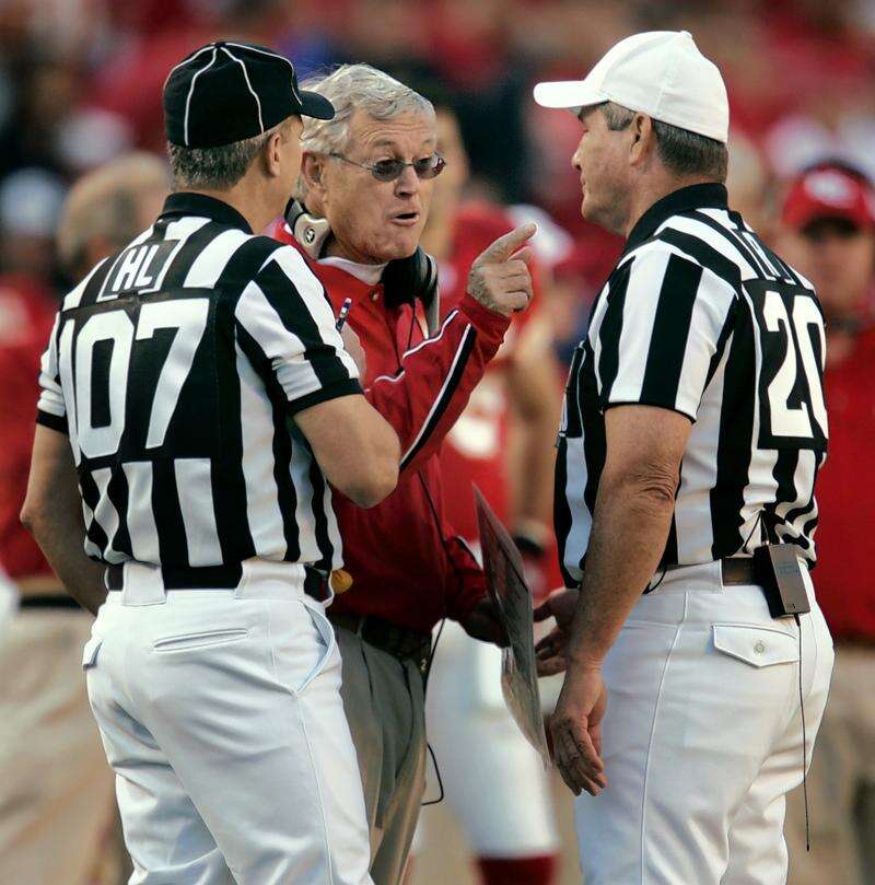 Kansas City Chiefs coach Dick Vermeil gives referee Larry Nemmers and earful after an unsportsmanlike conduct foul was called in a 2006 game at Arrowhead Stadium. Associated Press