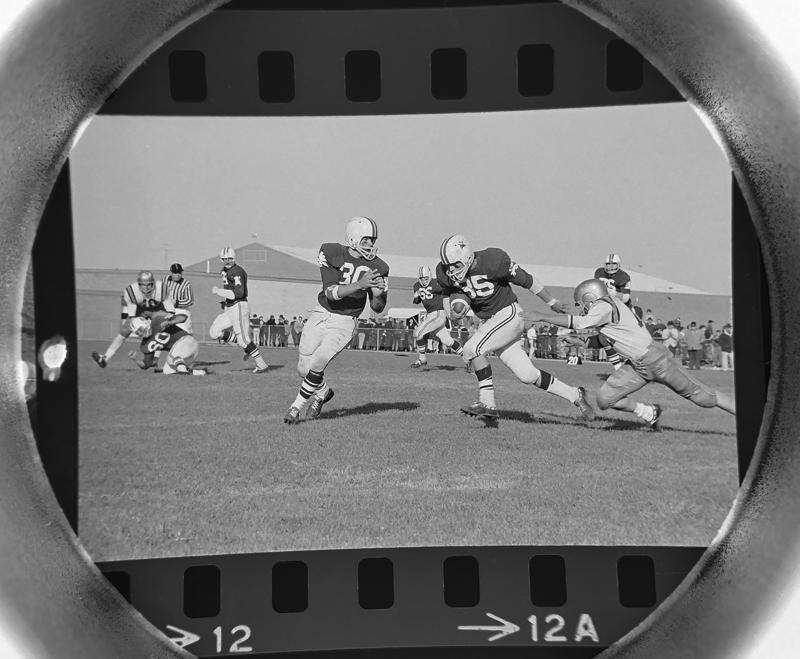 The Daily Herald Archive, Assignment # 5,116, Tom Grieger photo: St. Viator runs the ball past a St. Mel defender in a homecoming football game battle at the Prospect High School stadium in October of 1966. St. Viator won the game 42-7.