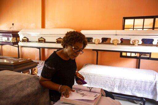 In this March 11, 2020 photo, morgue worker Evala Jeanty checks a list of coffin models chosen by the parents of children who died in a Feb. 13, 2020 fire at a children's home run by the Church of Bible Understanding (COBU), to get the coffins ready amid ongoing autopsies in Pétion-Ville, Haiti. For the death of each child, the church offered to pay just $50 to $100 in compensation to families, along with $150 for funeral costs, while it reported revenue of $6.6 million and expenses of $2.2 million to New York State and the Internal Revenue Service. (AP Photo/Dieu Nalio Chery) The Associated Press