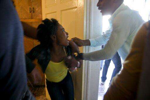FILE - In this Feb. 14, 2020 file photo, a girl yells, "I don't want to go!" as a state employee attempts to remove her from one of the children's homes run by the Church of Bible Understanding (COBU), in the Kenscoff area on the outskirts of Port-au-Prince, Haiti. Haiti's national child-welfare institute shut down the homes after the fire, and took 28 children into custody to be reunited with family members. More than 100 other children fled. (AP Photo/Dieu Nalio Chery, File) The Associated Press