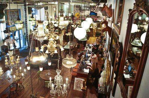 FILE - In this Nov. 22, 2013 file photo, rare chandeliers and light fixtures hang at the Olde Good Things antique store in New York, owned by the the Church of Bible Understanding (COBU). The wealth of the church in the United States has long stood in contrast with the shoddiness of its two children's homes in Haiti, which have faced years of infractions and failed two state inspections. (AP Photo/Bebeto Matthews, File) The Associated Press