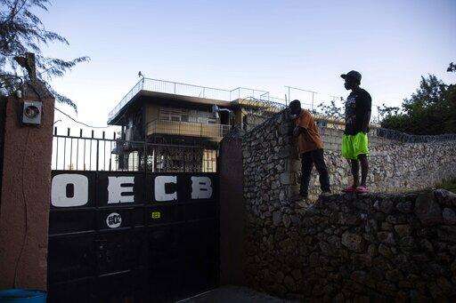 FILE - In this March 14, 2020 file photo, residents stand on top of a wall to see inside the property of a children's home run by the Church of Bible Understanding (COBU) where a fire broke out the previous month in Kenscoff, on the outskirts of Port-au-Prince, Haiti. The lawyer for the church, Osner Fevry, said the church members running the homes left for the U.S. a few days after the fire not to avoid prosecution, but because they were hounded by local media. (AP Photo/Dieu Nalio Chery, File) The Associated Press