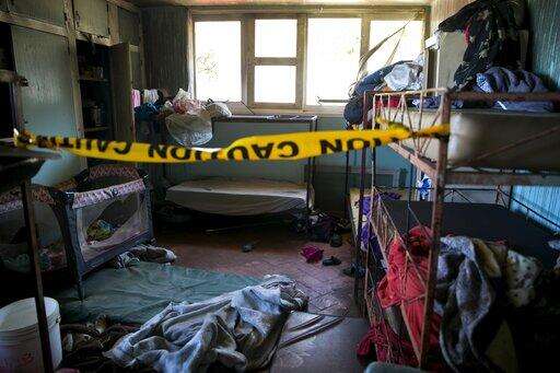 FILE - In this Feb. 14, 2020 file photo, police tape hangs inside an empty room at a children's home run by the Church of Bible Understanding (COBU) where a fire broke out the previous night, in Kenscoff, on the outskirts of Port-au-Prince, Haiti. Haitian prosecutors have begun a criminal investigation into the church's homes, which held a total of 154 children at the time of the fire, according to Haiti's children's welfare agency. (AP Photo/Dieu Nalio Chery, File) The Associated Press