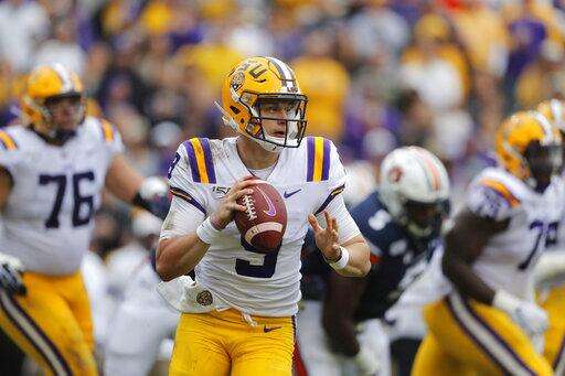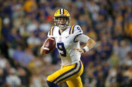 FILE - In this Oct. 26, 2019, file photo, LSU quarterback Joe Burrow (9) scrambles during the first half of the team's NCAA college football game against Auburn in Baton Rouge, La. Burrow is the top quarterback heading in the upcoming NFL draft. (AP Photo/Gerald Herbert, File) The Associated Press