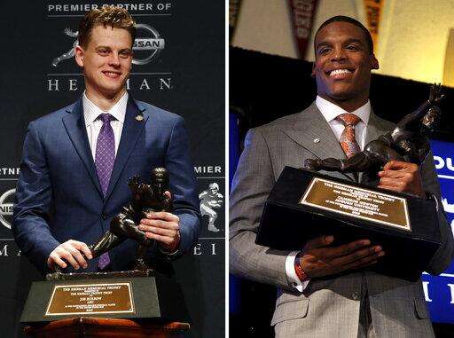 FILE - At left, in a Dec. 14, 2019, file photo, NCAA college football player and Heisman Trophy finalist, LSU quarterback Joe Burrow, talks to the media during a press conference before the start of Heisman Trophy ceremonies in New York. At right, in a Dec. 11, 2011, file photo, Auburn quarterback Cam Newton holds the trophy during a news conference after winning the Heisman award in New York. Burrow could join Cam Newton as the only quarterbacks since 1967 to become the NFL's first overall draft pick right after winning both the Heisman Trophy and the national championship.(AP Photo/File) The Associated Press