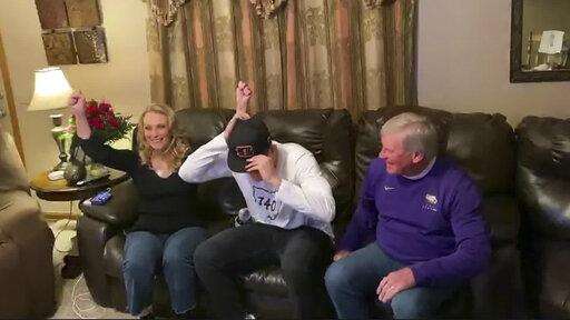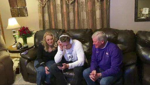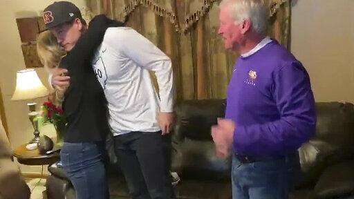 CORRECTS LOCATION TO THE PLAINS, OHIO, INSTEAD OF ATHENS, OHIO - In this still image from video provided by the NFL, LSU quarterback Joe Burrow, in The Plains, Ohio, is chosen first by the Cincinnati Bengals during the NFL football draft, Thursday, April 23, 2020. (NFL via AP) The Associated Press