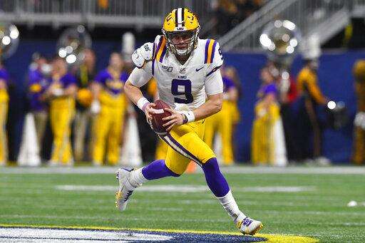 FILE - In this Dec. 7, 2019, file photo, LSU quarterback Joe Burrow (9) runs down field against Georgia during the first half of the Southeastern Conference championship NCAA college football game in Atlanta. Burrow is expected to be a first round pick at the NFL Draft on Thursday, April 23, 2020.(AP Photo/John Amis) The Associated Press