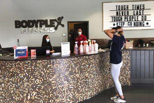 At the reopened Bodyplex Fitness Adventure in Grayson, a dozen people in masks required by the gym worked out on two floors, spraying down machines and weights with a sanitizer bottle staff handed each person. The gym had a fraction of its usual of customers and provided ample space for people to work out apart, yet some talked and stood close to one another anyway.