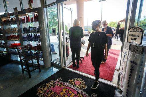 Employees and customers walk in to Three-13 Salon, Spa & Boutique on Friday, April 24, 2020, in Marietta, Ga. The salon had been closed for more than a month due to the new coronavirus. Barber shops, nail salons, gyms and a few other businesses reopened in Georgia on Friday as the Republican governor eased a month-long shutdown despite warnings from health experts of a potential new surge of coronavirus infections.(AP Photo/Ron Harris)