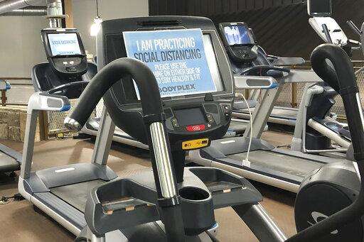A sign on posted on gym equipment, advises patrons to practice social distancing amid the COVID-19 virus outbreak at Bodyplex Fitness Adventure on Friday, April 24, 2020, in Grayson, Ga. Gov. Brian Kemp announced this week the resumption of elective medical procedures, as well as the reopening of certain close-contact businesses like gyms, barbershops and tattoo parlors. (AP Photo/Sudhin Thanawala)