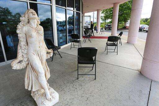 Folding chairs for customers are placed outside Three-13 Salon, Spa & Boutique on Friday, April 24, 2020, in Marietta, Ga. The salon had been closed for more than a month due to the new coronavirus. Barber shops, nail salons, gyms and a few other businesses reopened in Georgia on Friday as the Republican governor eased a month-long shutdown despite warnings from health experts of a potential new surge of coronavirus infections. (AP Photo/Ron Harris)