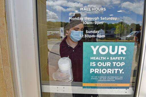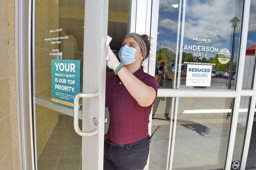 Kendall Ballew an employee of the Anderson Mall cleans the doors before the Anderson Mall opened to limited business after South Carolina Governor Henry McMaster eased restrictions due to coronavirus, Friday, April 24, 2020, in Anderson, S.C. (AP Photo/Richard Shiro)