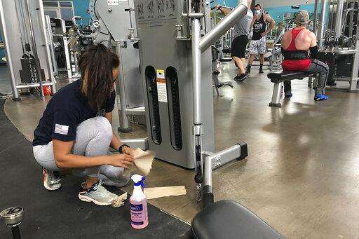 Sterling Henderson, 27, cleans gym equipment at Bodyplex Fitness Adventure on Friday, April 24, 2020, in Grayson, Ga. Gov. Brian Kemp announced this week the resumption of elective medical procedures, as well as the reopening of certain close-contact businesses like gyms, barbershops and tattoo parlors that were closed due to coronavirus concerns. Henderson said she was "ecstatic" the gym had reopened. "I think they're doing a pretty good job of keeping everyone apart and cleaning. And there's not that many people here now, said Henderson.". (AP Photo/Sudhin Thanawala)
