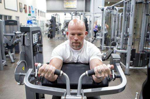 Noah Nichols works out at the Rock Fitness Center on Friday, April 24, 2020 in Ringgold, Ga. Gyms, along with hair salons, bowling alleys and tattoo parlors were among the businesses allowed to open on Friday. (C.B. Schmelter/Chattanooga Times Free Press via AP)