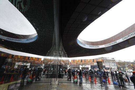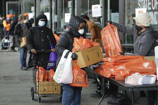 People line up for a mobile food pantry at Barclays Center Friday, April 24, 2020, in the Brooklyn borough of New York. (AP Photo/Frank Franklin II) The Associated Press