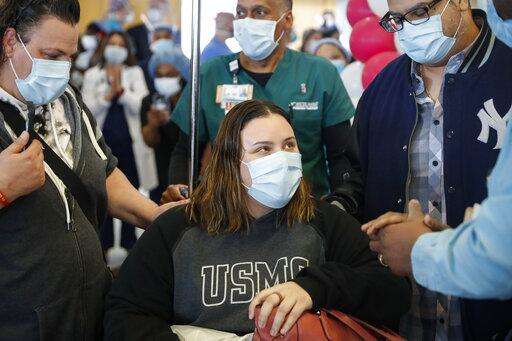 Bianca Jimenez, 19, center, is offered a prayer by a spiritual care work alongside her mother Dawn, left, and father Franklin, right, while being cheered by hospital staff as the 600th COVID-19 patient discharged from hospital care, Friday, April 24, 2020, at Mount Sinai South Nassau in Oceanside, N.Y. (AP Photo/John Minchillo) The Associated Press