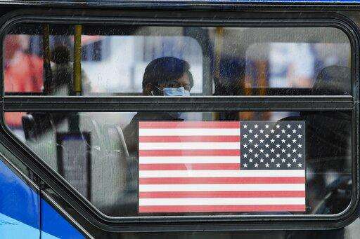Customers wear personal protective equipment as they board an MTA bus as it operates without fees, Friday, April 24, 2020, in the Bronx borough of New York. (AP Photo/John Minchillo) The Associated Press