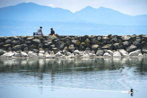 People enjoy the warm spring weather on the shore of the Lake Geneva, while gatherings of more than 5 people is currently prohibited in a bid to curb the spread of coronavirus, in Lausanne, Switzerland, Saturday, April 25, 2020. (Laurent Gillieron Keystone via AP) The Associated Press