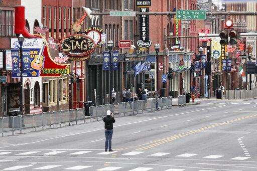 FILE - In this March 23, 2020, file photo, a man stands in the middle of Broadway to take a photo where the streets and sidewalks are normally filled in Nashville, Tenn. Many Nashville musicians have been without steady work for more than five weeks since the city shut down its clubs to slow the spread of the coronavirus. (AP Photo/Mark Humphrey, File) The Associated Press