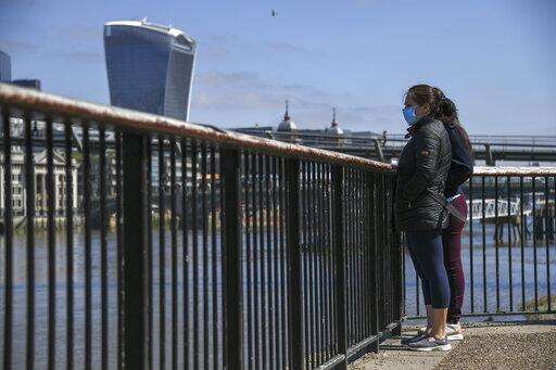Two women wear protective masks on the south bank of the river Thames, as the lockdown due to the coronavirus outbreak continues, in London, Saturday, April 25, 2020.(AP Photo/Alberto Pezzali) The Associated Press