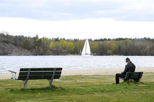 A man sits alone on a bench on the beach of lake Malaren, during the coronavirus outbreak in Satra south east of Stockholm, Saturday, April 25, 2020. (Henrik Montgomery/TT News Agency via AP) The Associated Press