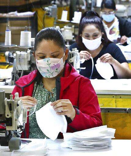 In this Thursday, April 23, 2020 photo, Romelia Barrientos, foreground, and other seamstresses work on edge binding and installing elastic on face masks at the Georgia Expo in Suwanee, Ga. The company has pivoted from sewing curtains to sewing cloth face masks. As business restrictions ease companies are preparing to open, but one key ingredient to safety is nearly impossible to find, personal protective equipment. (Curtis Compton/Atlanta Journal-Constitution via AP) The Associated Press