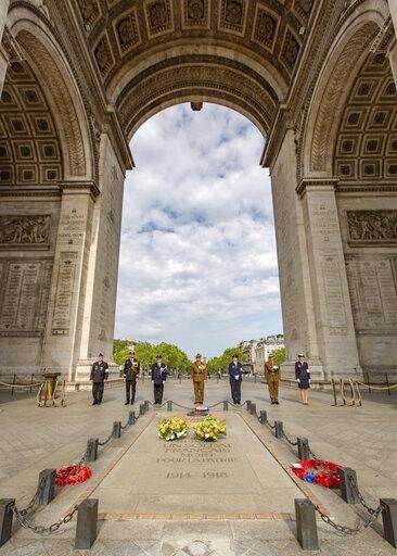 This photo provided by the Australian Embassy in Paris, shows Australian Defense Attache to France Colonel Joel Dooley and ADF members paying their respects at the tomb of the unknown soldier beneath the Arc de Triomphe in Paris, Saturday April 25, 2020, on the occasion of Anzac Day. With France in coronavirus lockdown, there were no crowds to mark ANZAC Day, a national day of remembrance in Australia and New Zealand for those who served in all wars. (Simon Patching/Australian Embassy in France via AP) The Associated Press