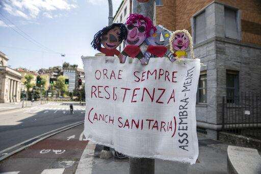 Puppets are attached to a street pole with a piece of cloth with writing reading "Now and always resistance (even sanitary) on the 75th anniversary of the Italian Liberation Day, in Milan, Italy, Saturday, April 25, 2020. Italy's annual commemoration of its liberation from Nazi occupation is celebrated on April 25 but lockdown measures in the coronavirus-afflicted country mean no marches can be held this year and the National Association of Italian Partisans has invited all to sing 'œBella Ciao", a communist resistance anthem. (AP Photo/Luca Bruno) The Associated Press