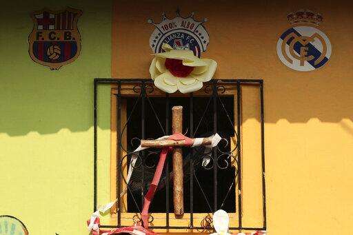 The logos of Spain's soccer teams Barcelona, left, and Real Madrid, right, flank an El Salvador Alianza F.C. logo, above a cross on a home's window, during a quarantine designed to slow the spread of the new coronavirus, in the Iberia community of San Salvador, El Salvador, Thursday, April 23, 2020. When the coronavirus appeared, President Nayib Bukele closed the borders and airports and imposed a mandatory home quarantine for all except those working in the government, hospitals, pharmacies or other designated businesses. People were allowed out only to buy groceries, and violators were detained, with more than 2,000 being held for 30-day stints. (AP Photo/Salvador Melendez) The Associated Press