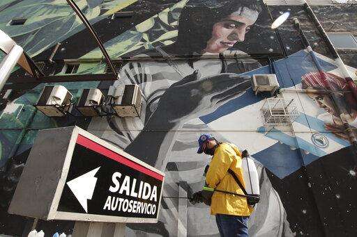 A worker disinfects a street as part of the measures to help slow the spread of the new coronavirus in San Salvador, El Salvador, Monday, April 20, 2020. (AP Photo/Salvador Melendez) The Associated Press