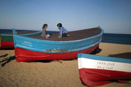Two children wearing face masks sit on top of a boat in a beach in Badalona, near Barcelona, Spain, Tuesday, April 28, 2020 as the lockdown to combat the spread of coronavirus continues. Health authorities in Spain are urging parents to be responsible and abide by social distancing rules a day after some beach fronts and city promenades filled with families eager to enjoy the first stroll out in six weeks. (AP Photo/Emilio Morenatti) The Associated Press