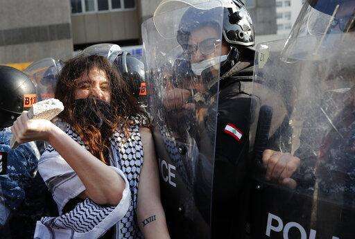 An anti-government protester confronts police with a stone during a protest against the deepening financial crisis, in Beirut, Lebanon, Tuesday, April 28, 2020. Hundreds of protesters set fire to two banks and hurled stones at soldiers, who responded with tear gas and batons in renewed clashes triggered by an economic crisis spiraling out of control amid a weeks-long virus lockdown. (AP Photo/Hussein Malla) The Associated Press