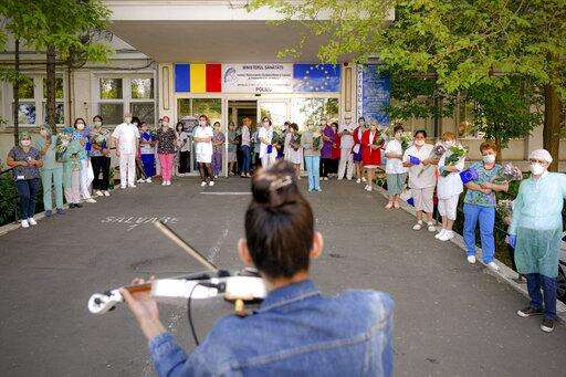 Medical staff of the Polizu maternity hospital listen to a violinist playing to entertain them and the patients in Bucharest, Romania, Tuesday, April 28, 2020. Raluca Raducanu, a young violinist, played a mix of rock and classical pieces during an under one hour performance outside the hospital. (AP Photo/Andreea Alexandru) The Associated Press