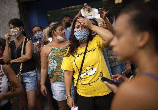 People out of work wait outside a government-run bank having technical problems to distribute their aid money amid the new coronavirus pandemic's affect on the economy in Rio de Janeiro, Brazil, Tuesday, April 28, 2020. (AP Photo/Silvia Izquierdo) The Associated Press