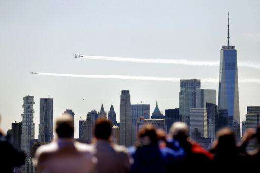People watch as a formation of the Blue Angels and Thunderbirds flight teams pass in front of the New York City skyline as seen from in Weehawken, N.J., Tuesday, April 28, 2020. The flyover was in salute to first responders in the fight against the new coronavirus. (AP Photo/Seth Wenig) The Associated Press
